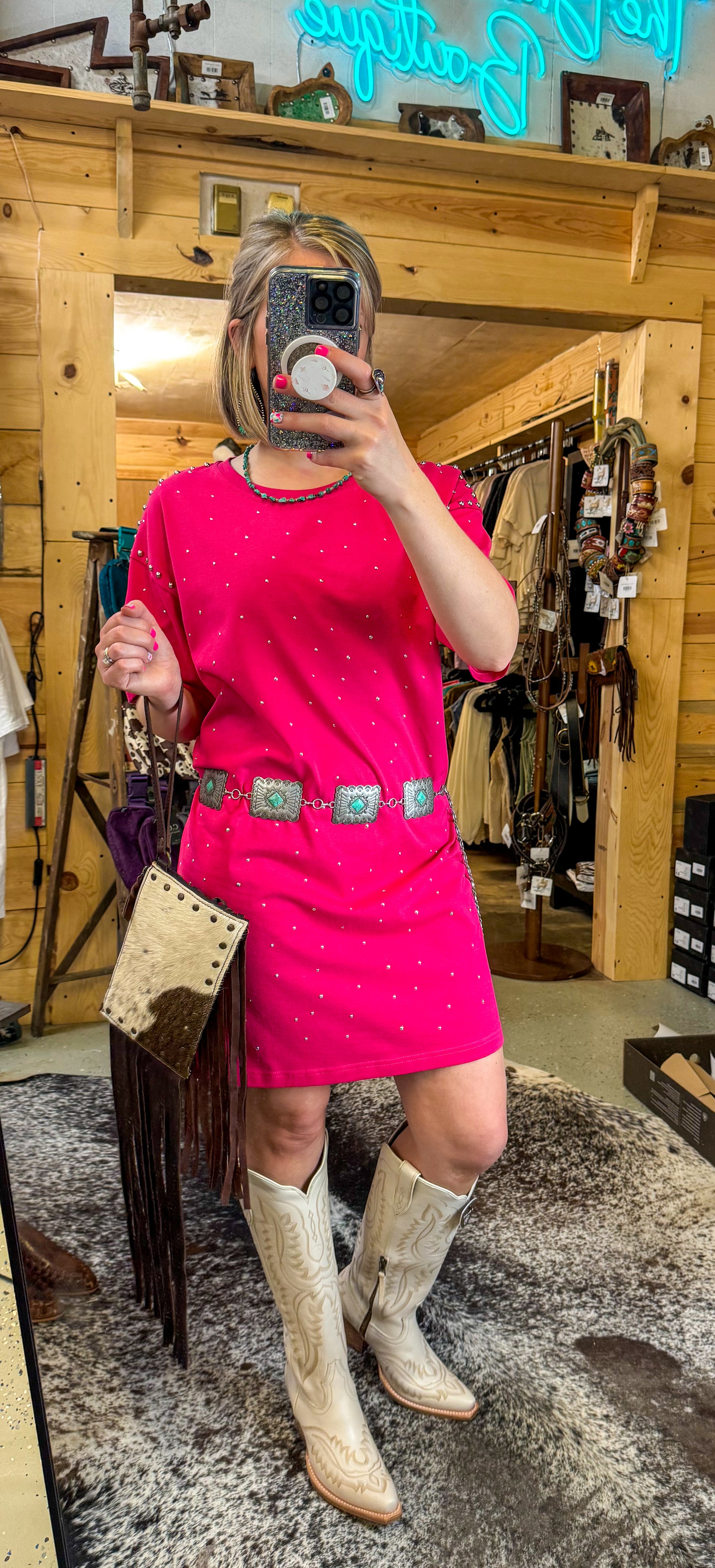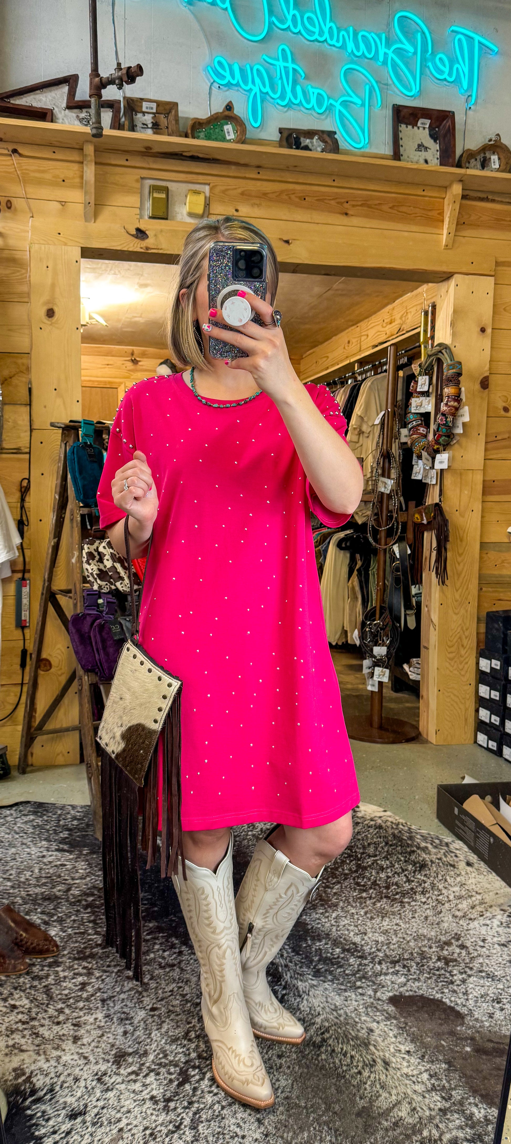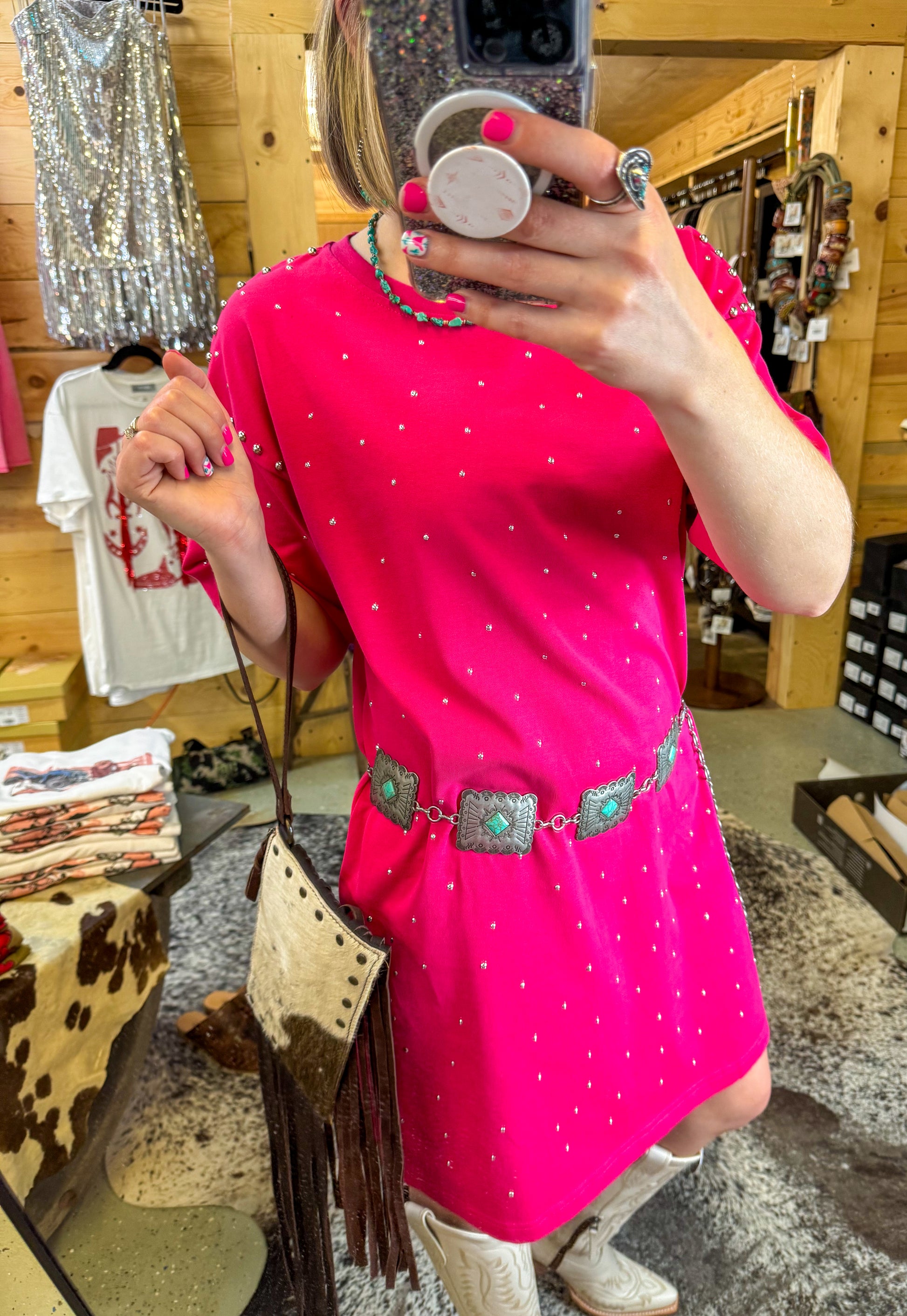 This Cotton Jersey Studded Sprinkle T Shirt Dress is designed with a generous fit. To achieve a more tailored look, consider sizing down. The dress is stunning and adorned with just the right amount of bling. It can be dressed up with boots and a belt, or dressed down with a pair of sneakers for a more casual look. Perfect for a concert or any occasion. It is made with high quality materials, making it a great addition to any wardrobe.