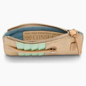 Keeping things light and easy, the card organizer is perfect for credit cards and folded bills. This metallic wallet’s snap-closure and zipper compartment provides security while you take on the day.