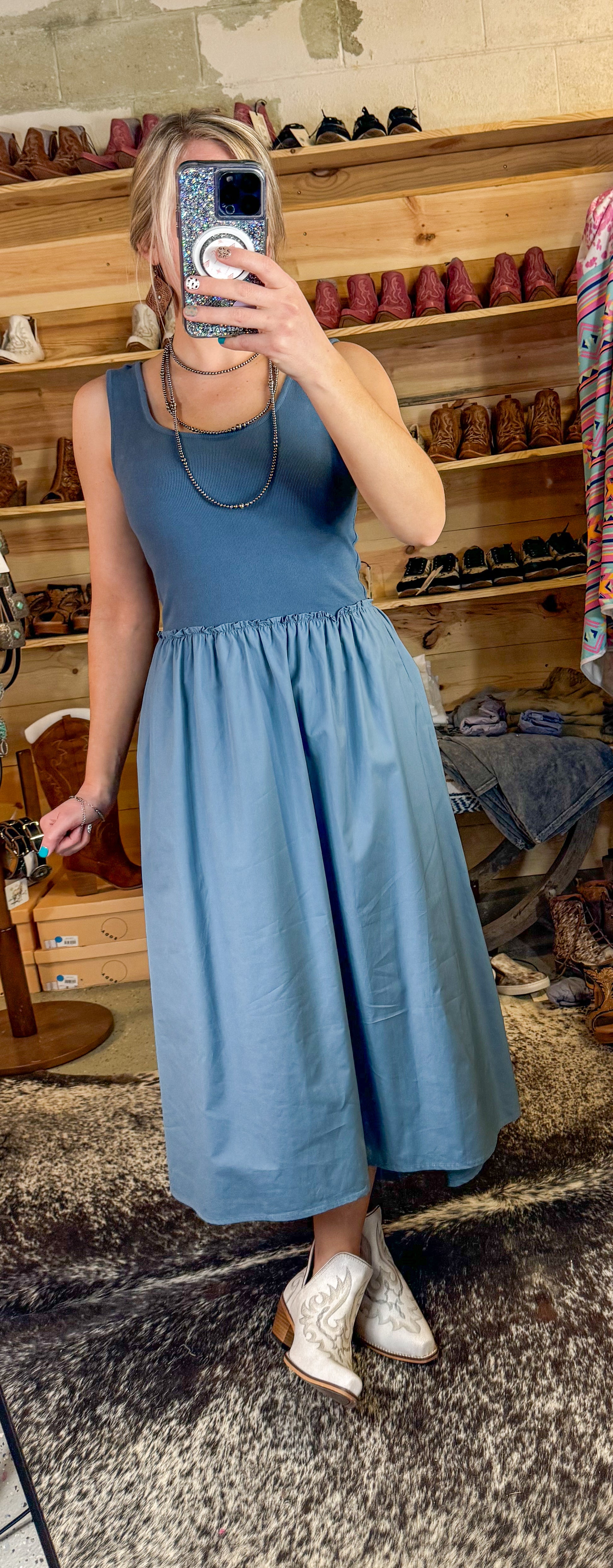 This true to size denim blue maxi dress is fitted in all the right places!