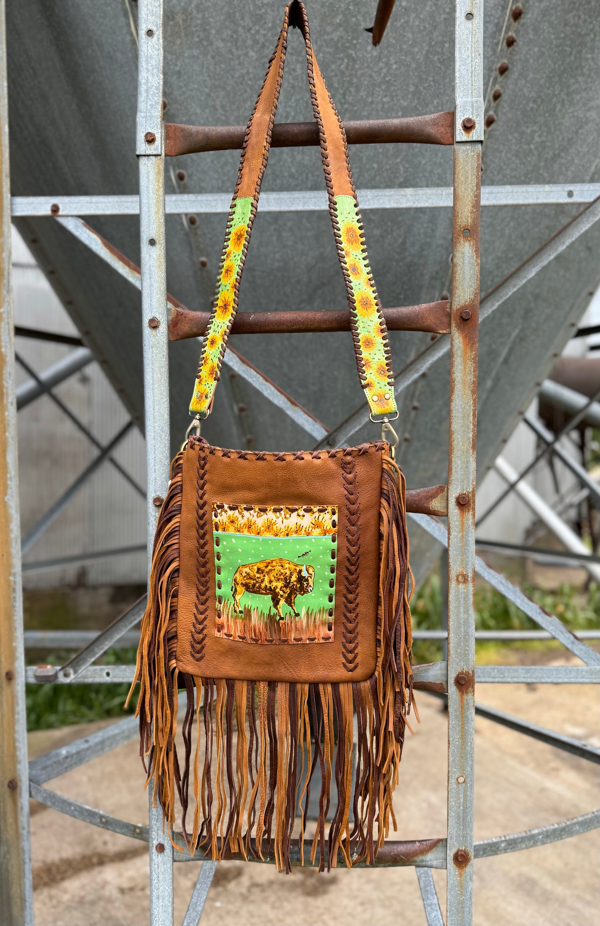 Genuine Leather Bag Hand Painted With Fringe 12x14