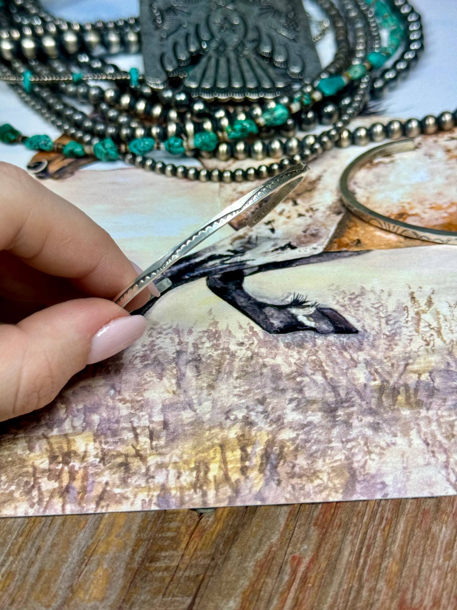 Sterling silver. Hand stamped. Navajo made. Design may vary slightly