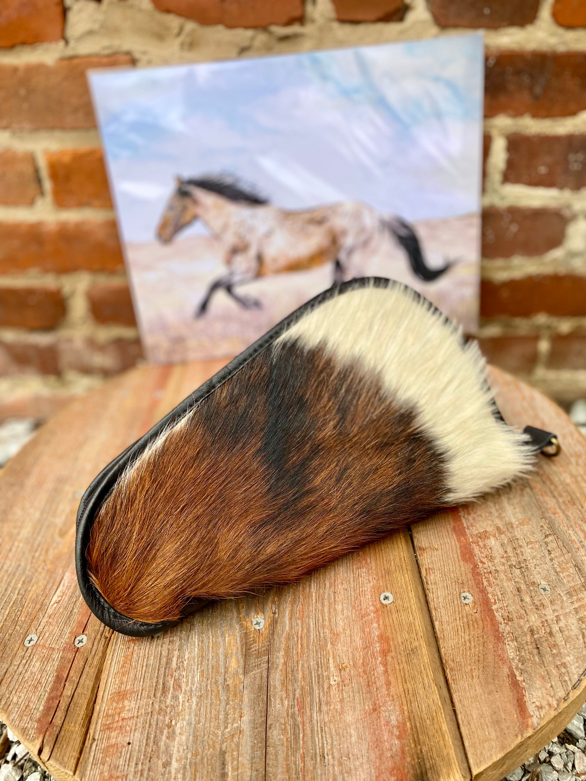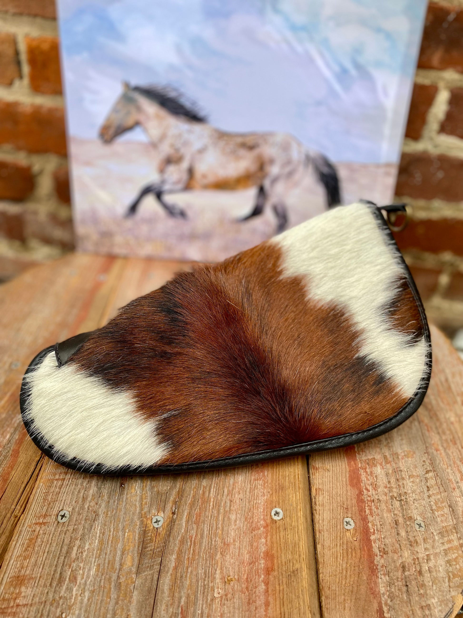 Genuine cowhide. 12 inches long by 6.5 inches at its widest measurement.