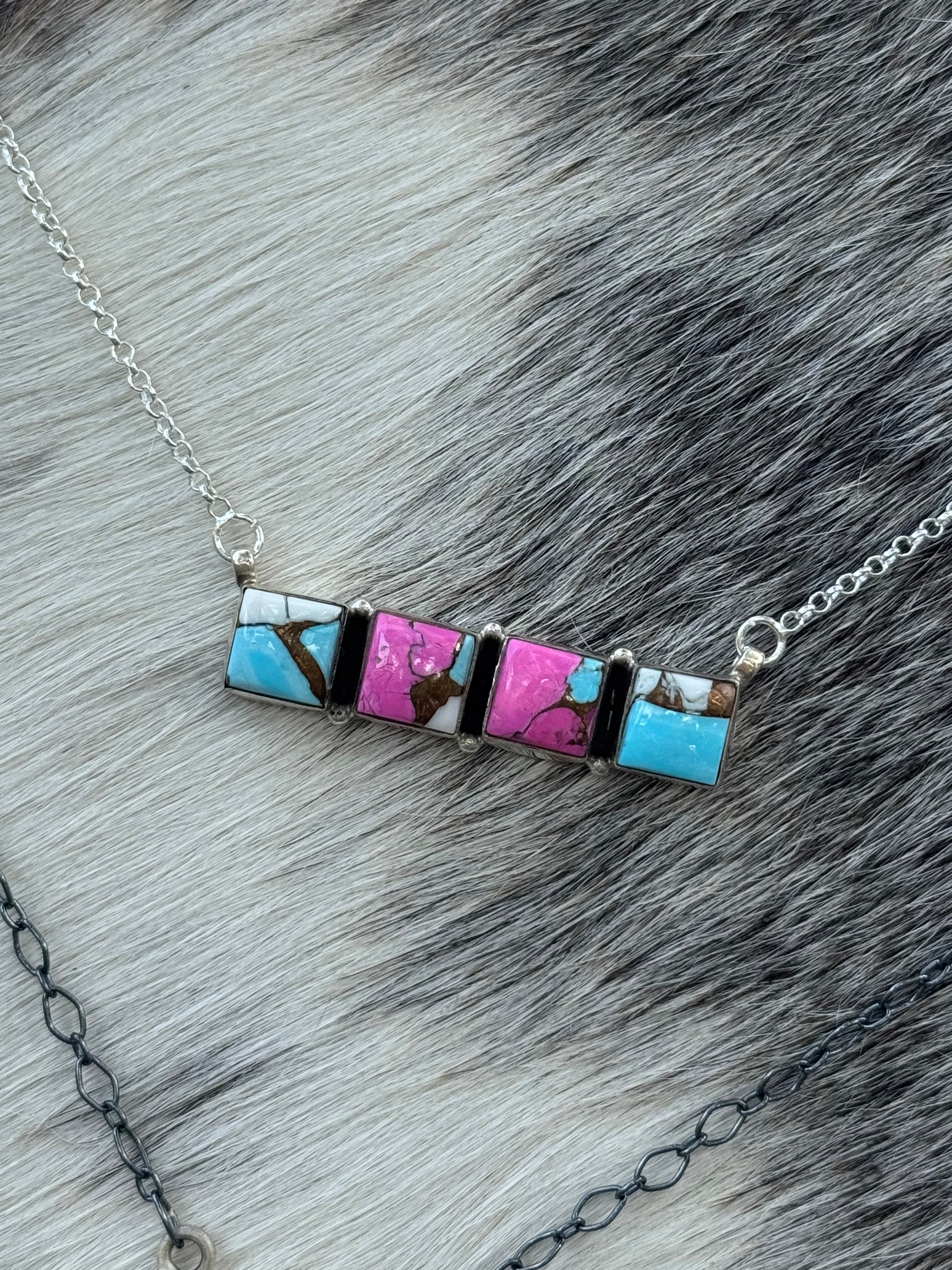 Handmade by Navajo artisans, the Sugar Cube Necklace features four stunning square stones in a cotton candy turquoise hue. With its unique design and high-quality craftsmanship, this necklace is a must-have accessory for any fashion-forward individual. Elevate your style and make a statement with this beautiful piece of jewelry.