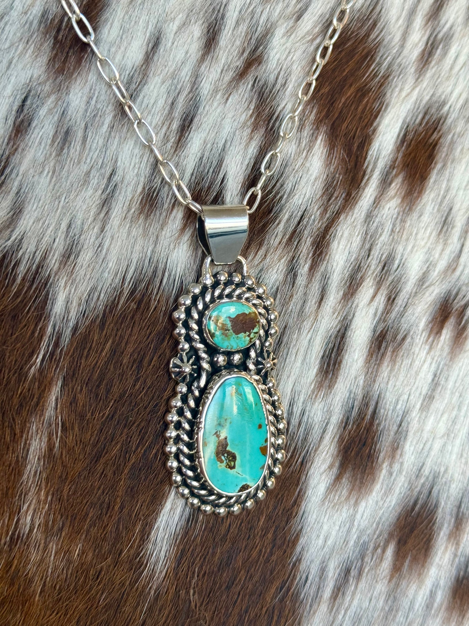 Expertly crafted with sterling silver, this pendant features two stunning turquoise stones and is handmade by a skilled artisan. Chain not included.