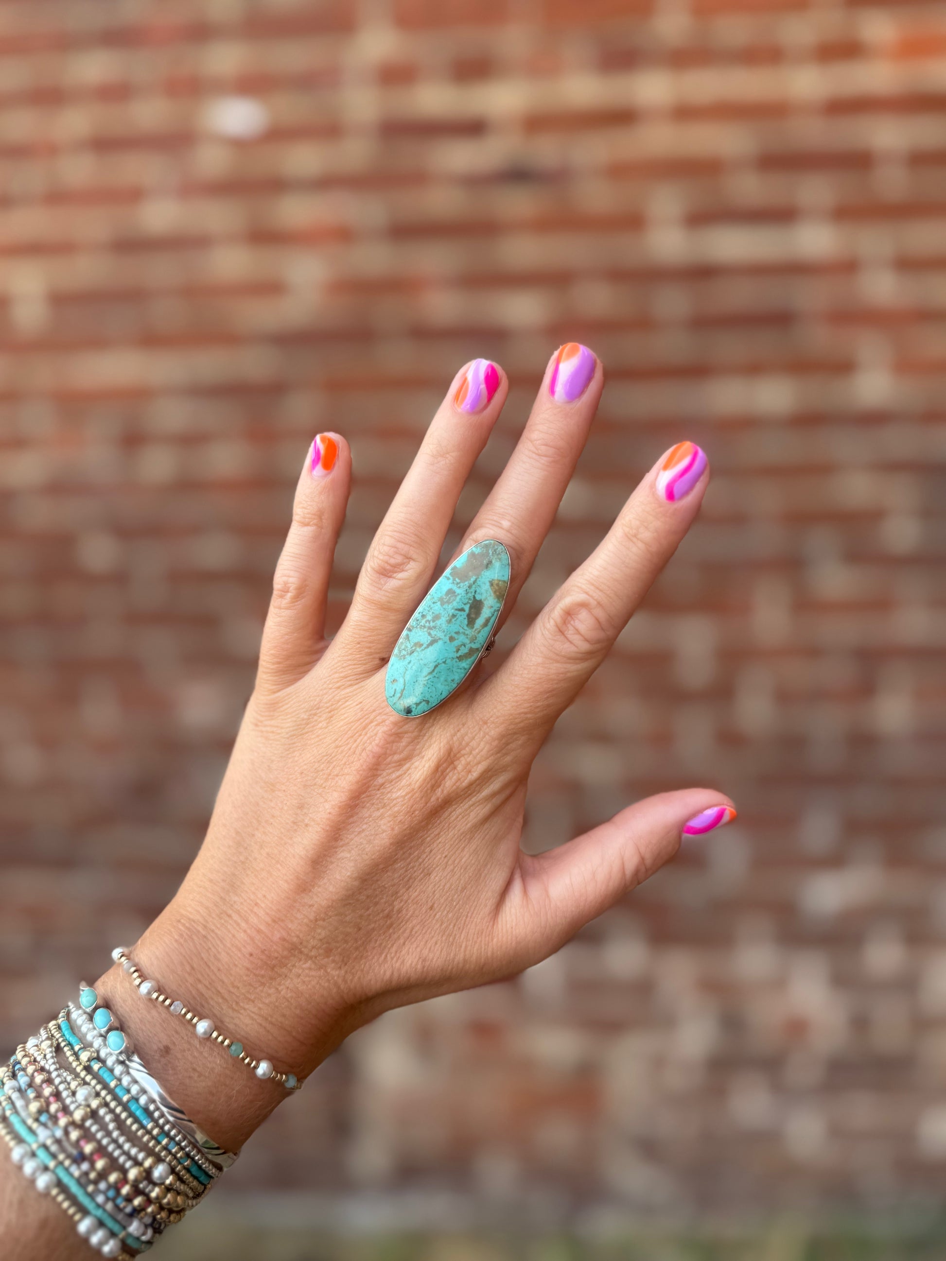 Crafted by expert jewelers, The Bonnie Ring boasts a stunning size 7.5 turquoise stone set in high-quality sterling silver. Experience timeless elegance and superior craftsmanship with this remarkable piece. (Biggest stone)