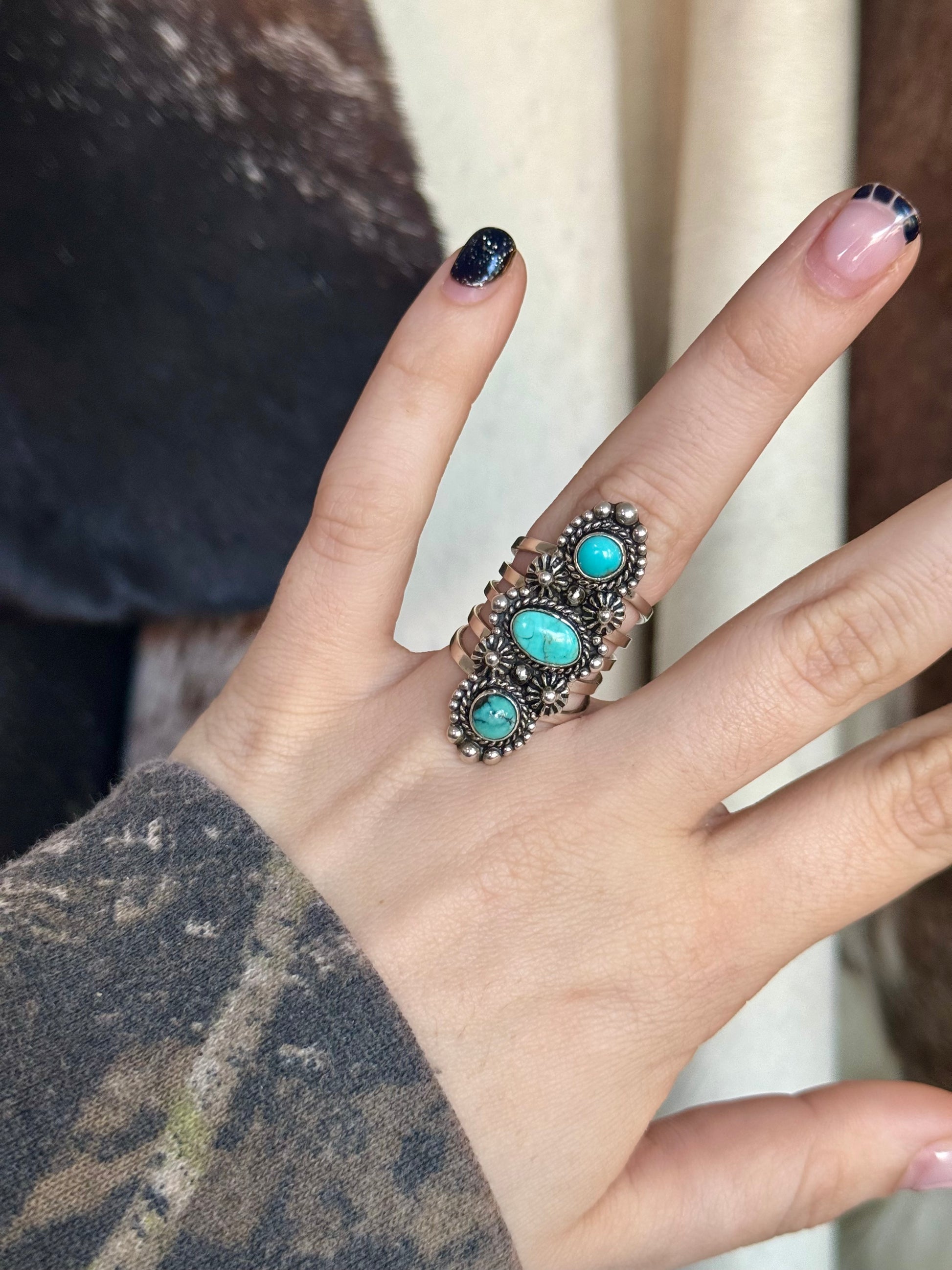 The Della Ring is comprised of stunning sterling silver with a size 7 band and three striking turquoise stones. The stones are skillfully encased by a sterling silver design, making this piece a true standout in any jewelry collection.