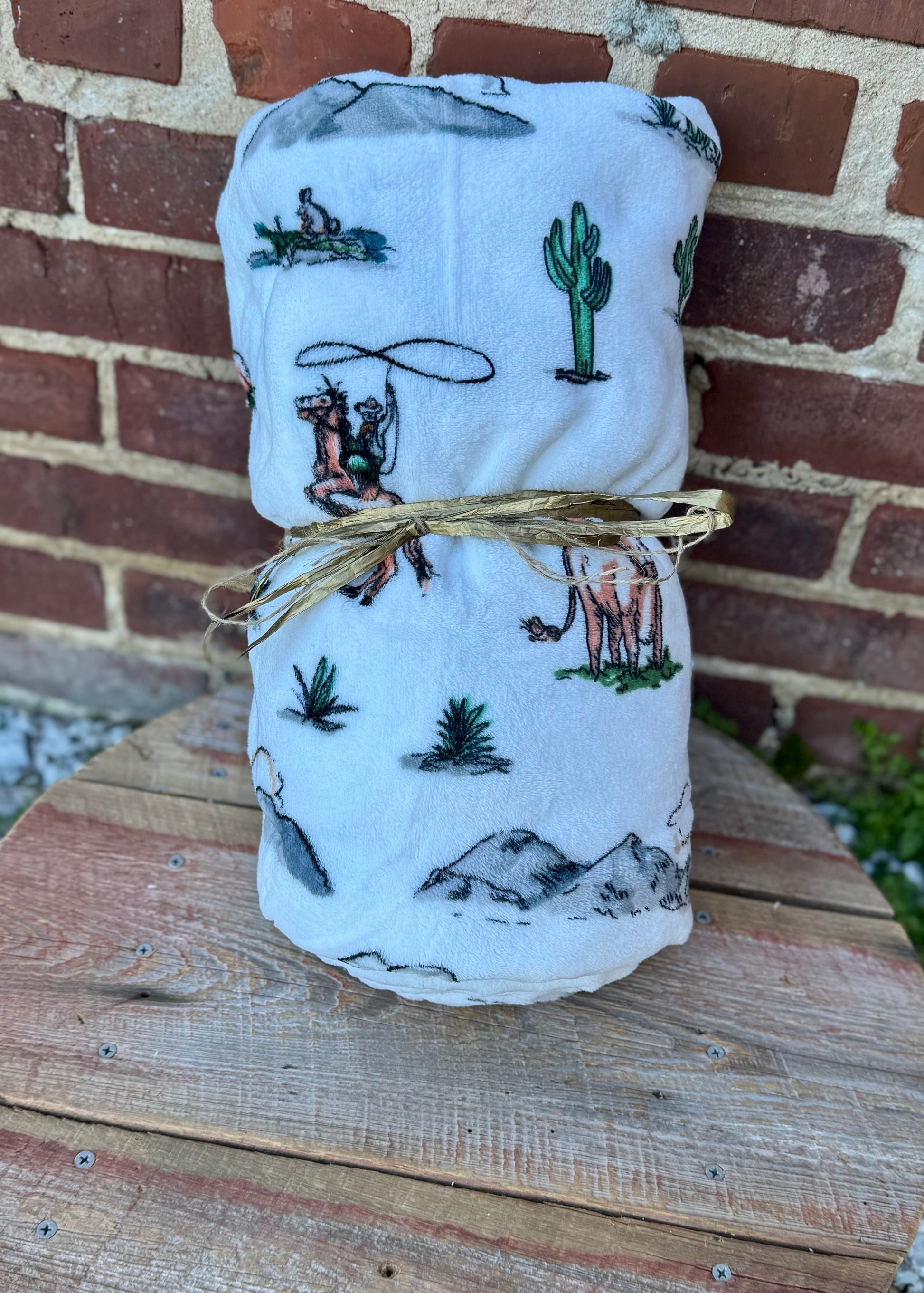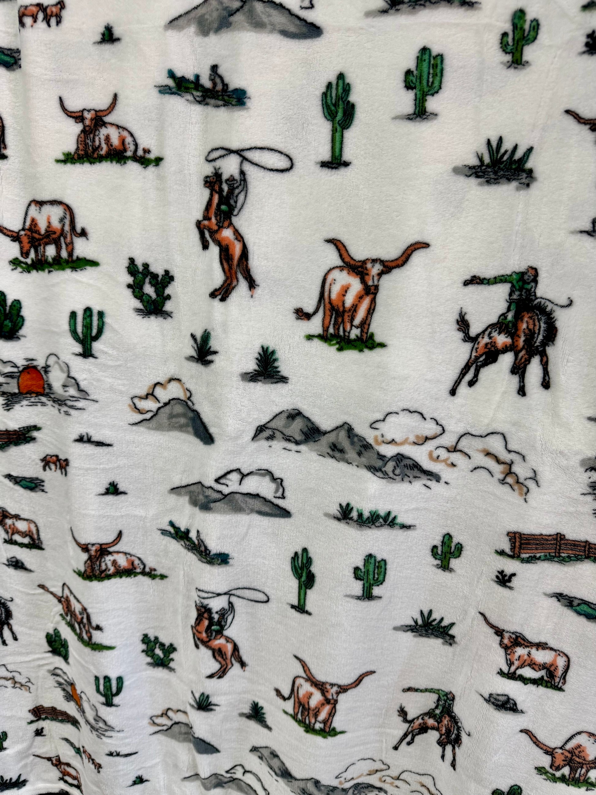 76" by 79" fleece blanket. Fun western print. Perfect oversized throw blanket.