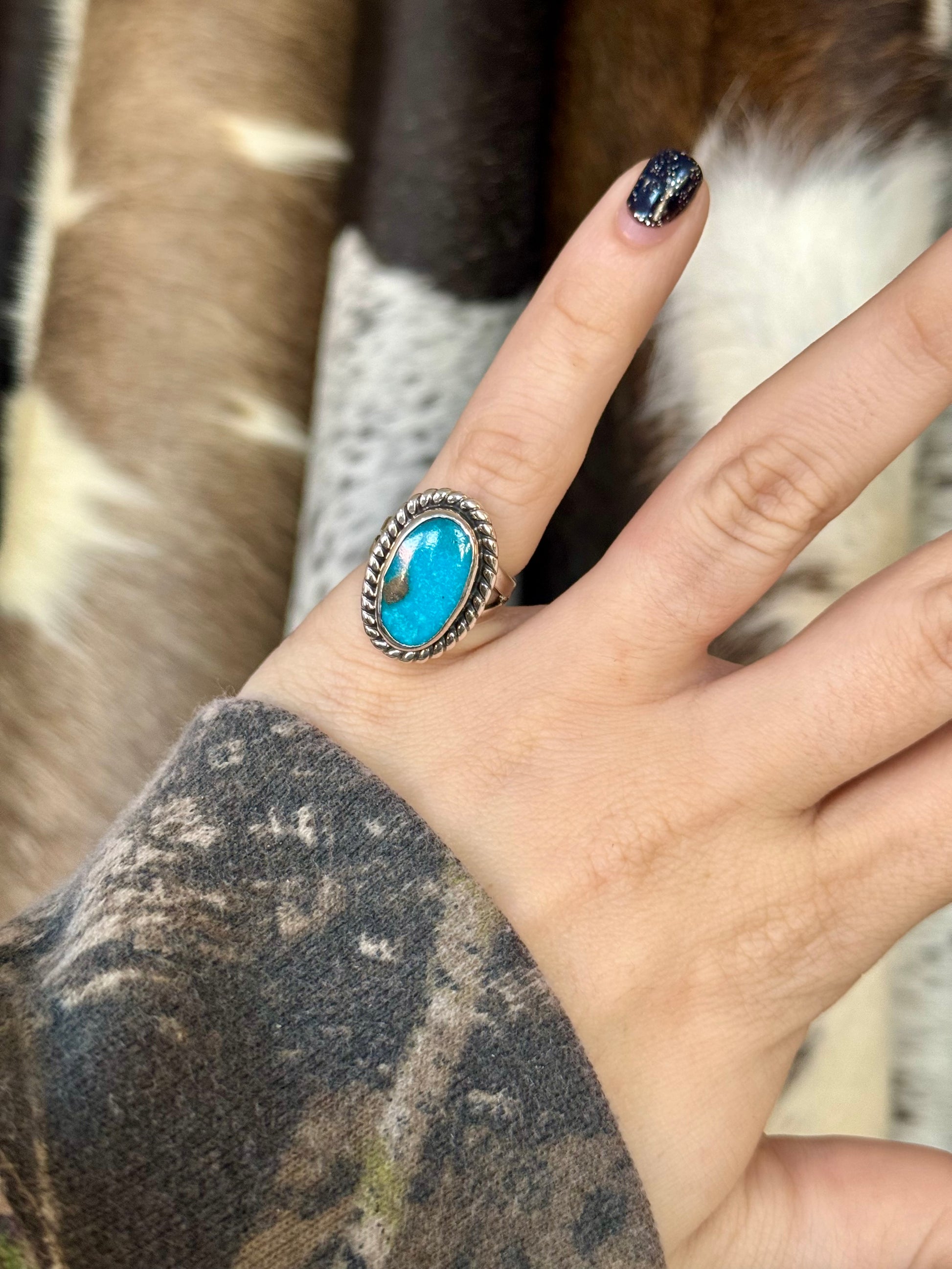 Crafted with expertise and precision, this ring boasts of a genuine turquoise stone encased in sterling silver, making it a perfect addition to your jewelry collection. Handmade with care to ensure superior quality, this ring is available in size 5 for your perfect fit.
