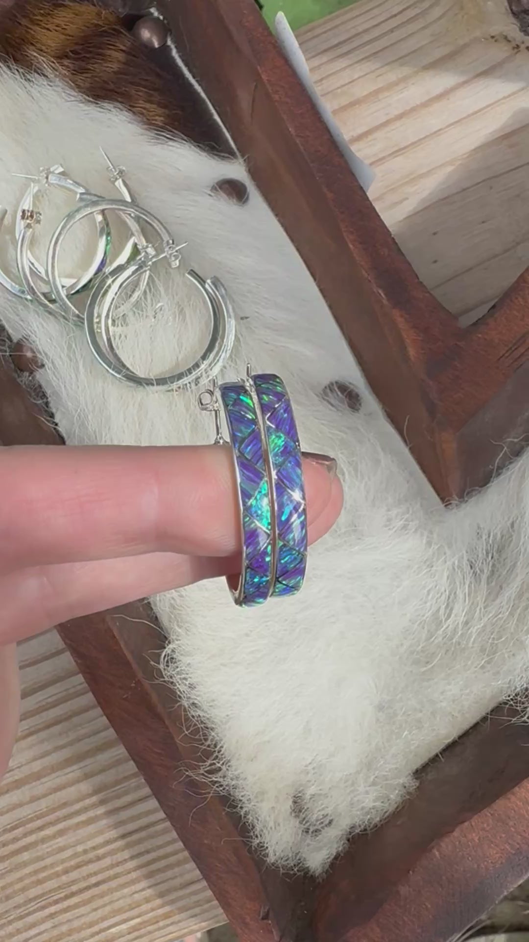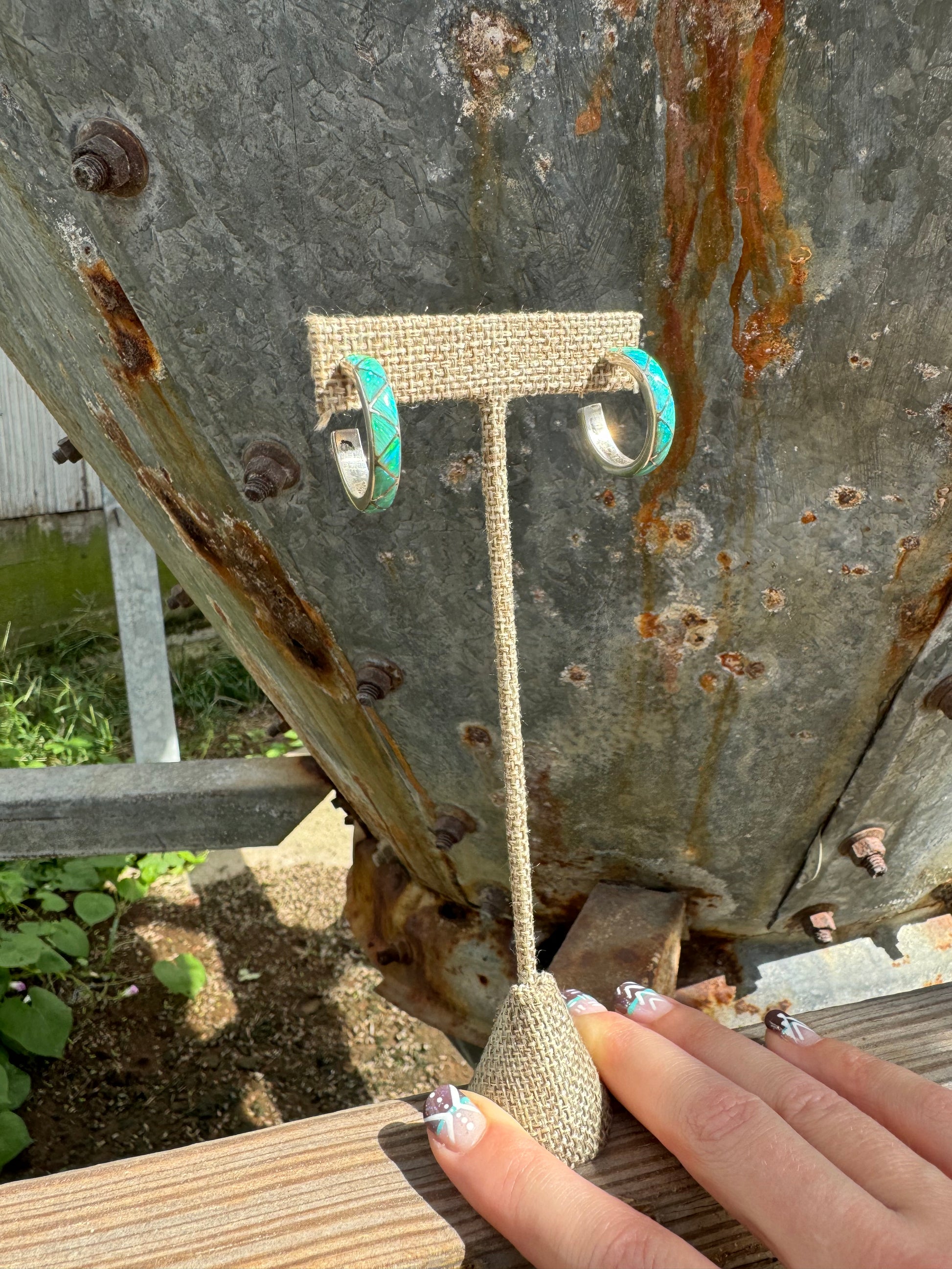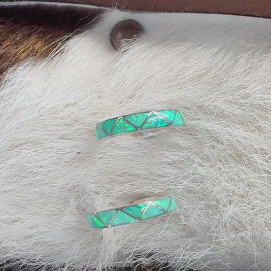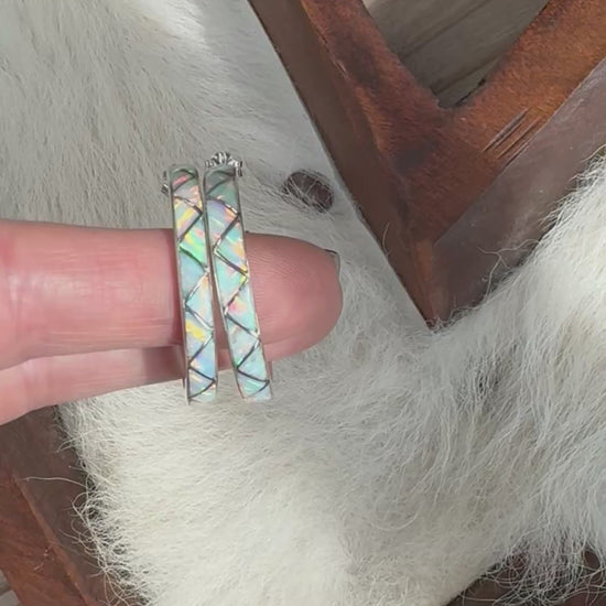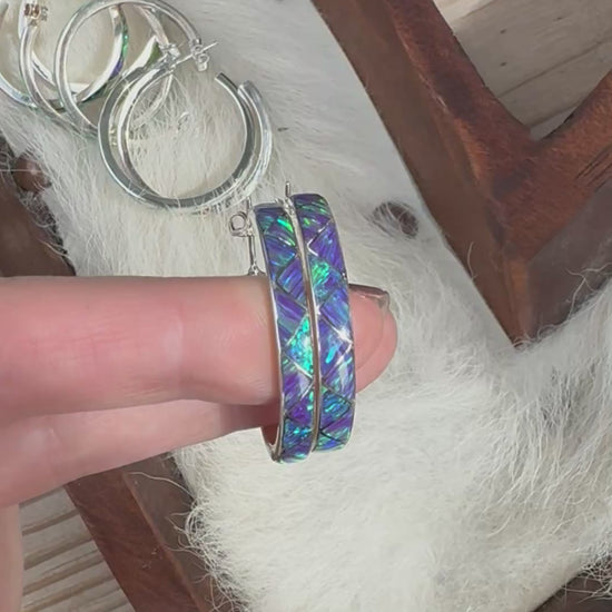 Sterling silver and genuine opal hoop earrings. 3.5 mm across the hoop. Each piece is handmade and unique. The natural opal stones tend to pick up colors they are around.