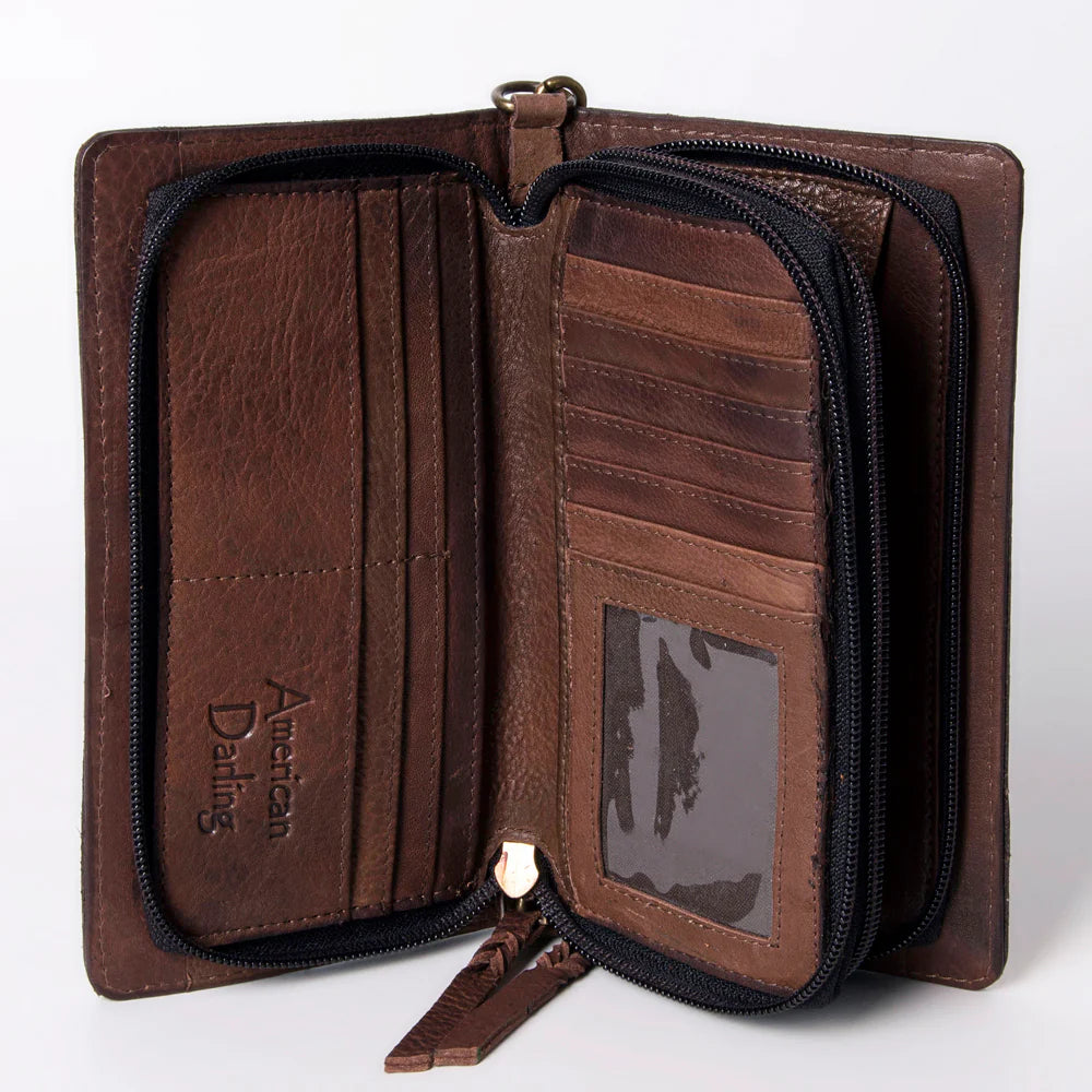 This gorgeous hand painted wallet purse has two zippered compartments making it more of a mini purse than a wallet. It comes with a wristlet strap and a shoulder strap that can both be easily added or removed.
