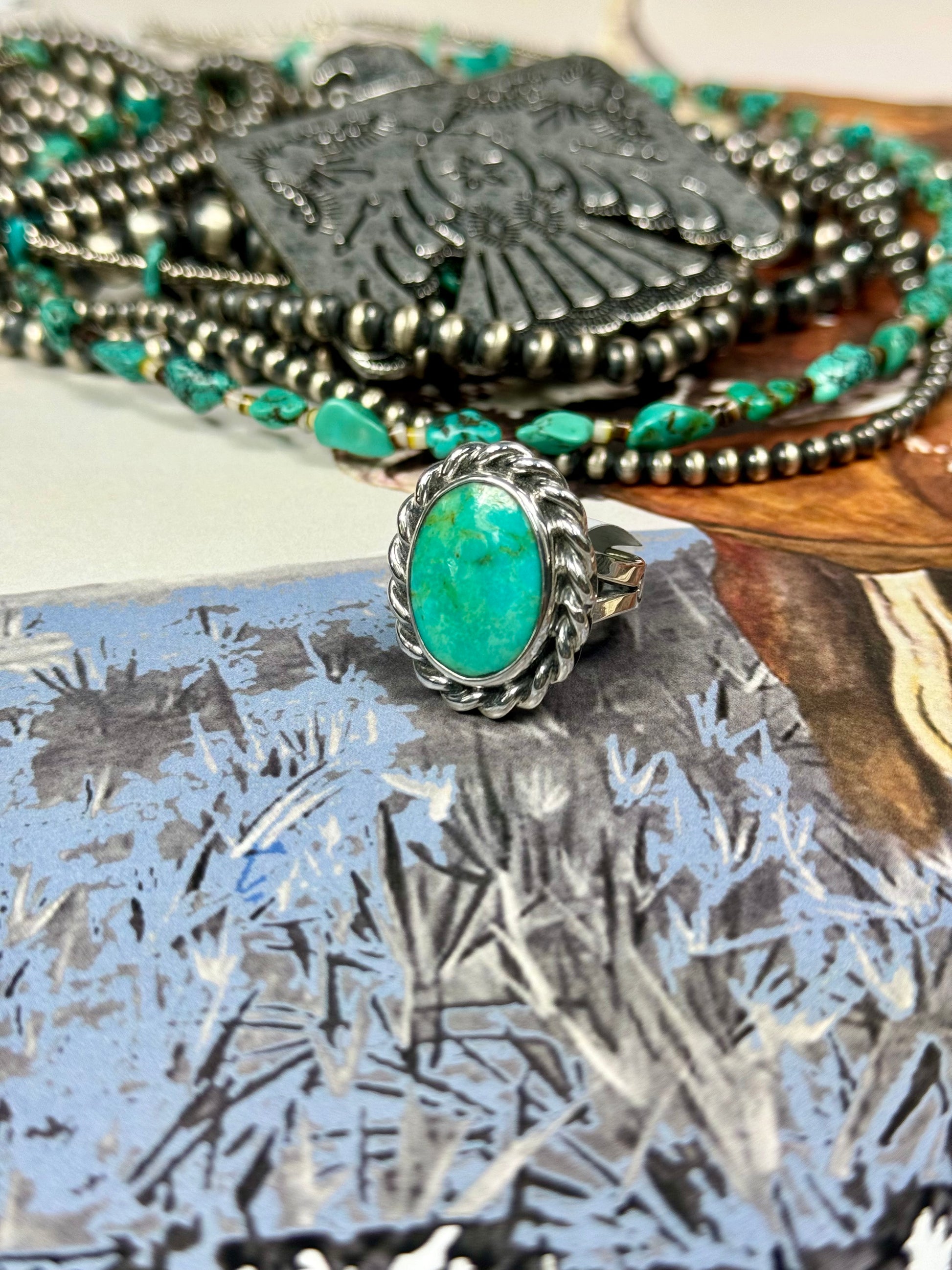 Genuine turquoise and Sterling silver. Hand-made. Size 9