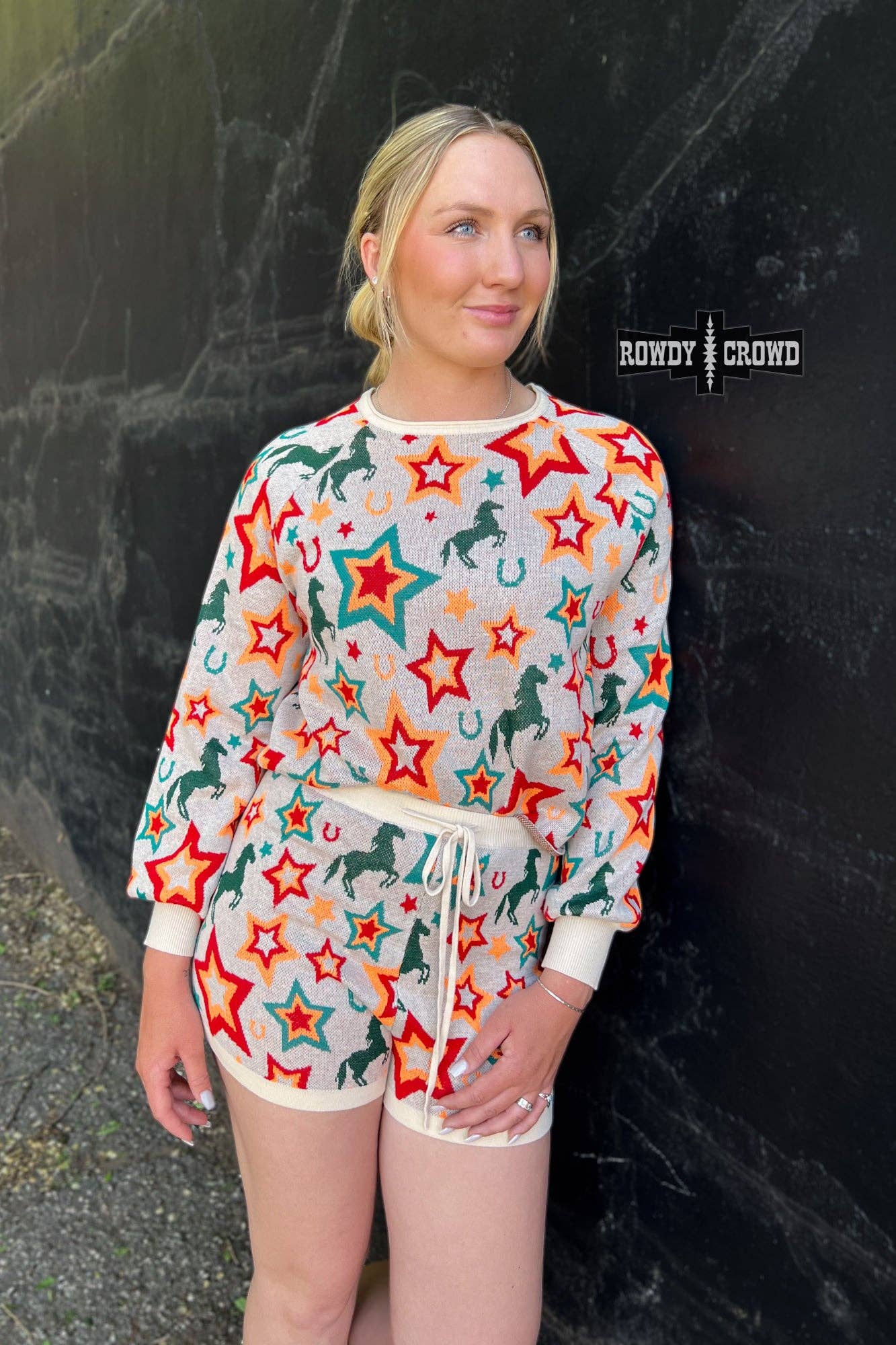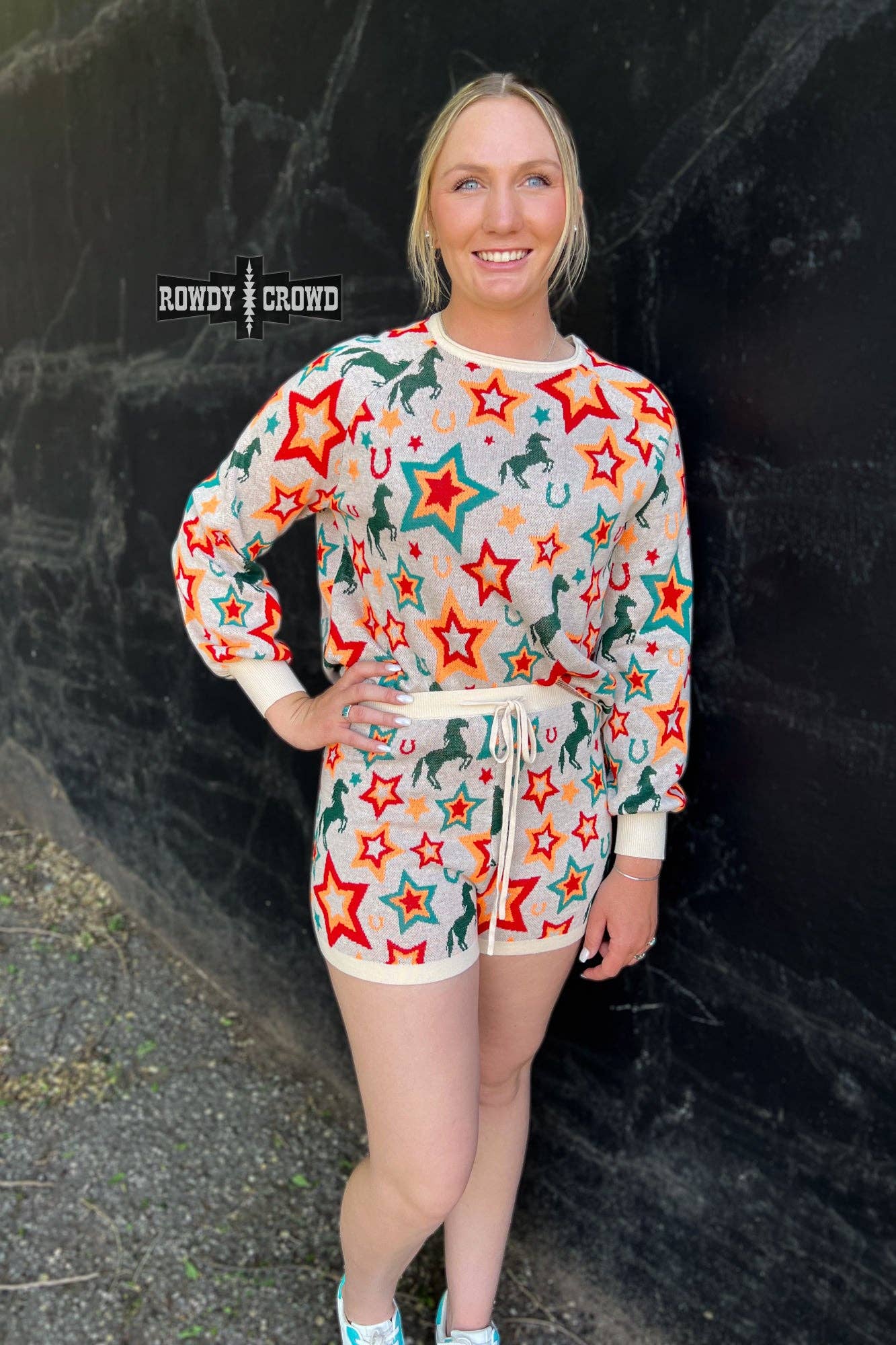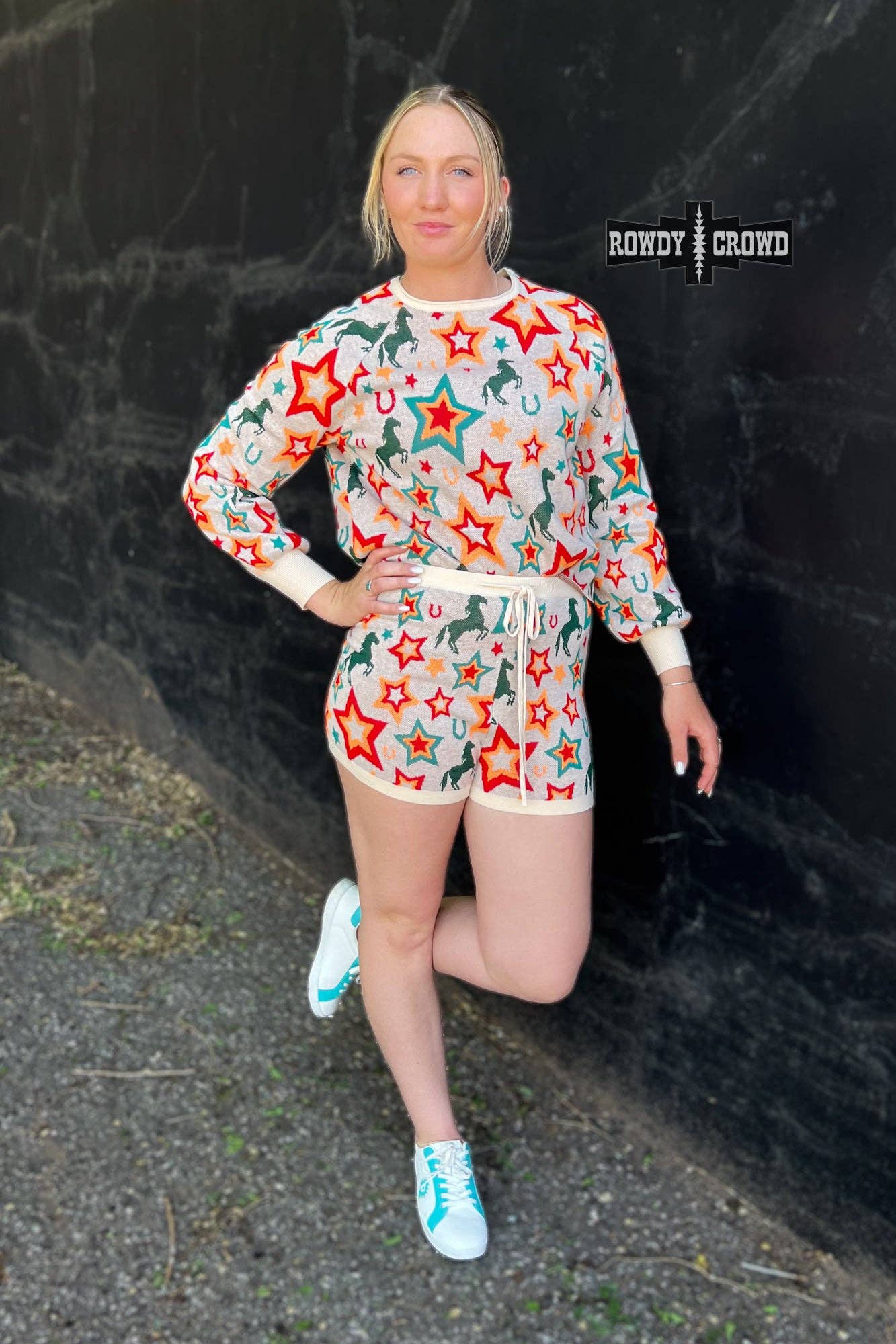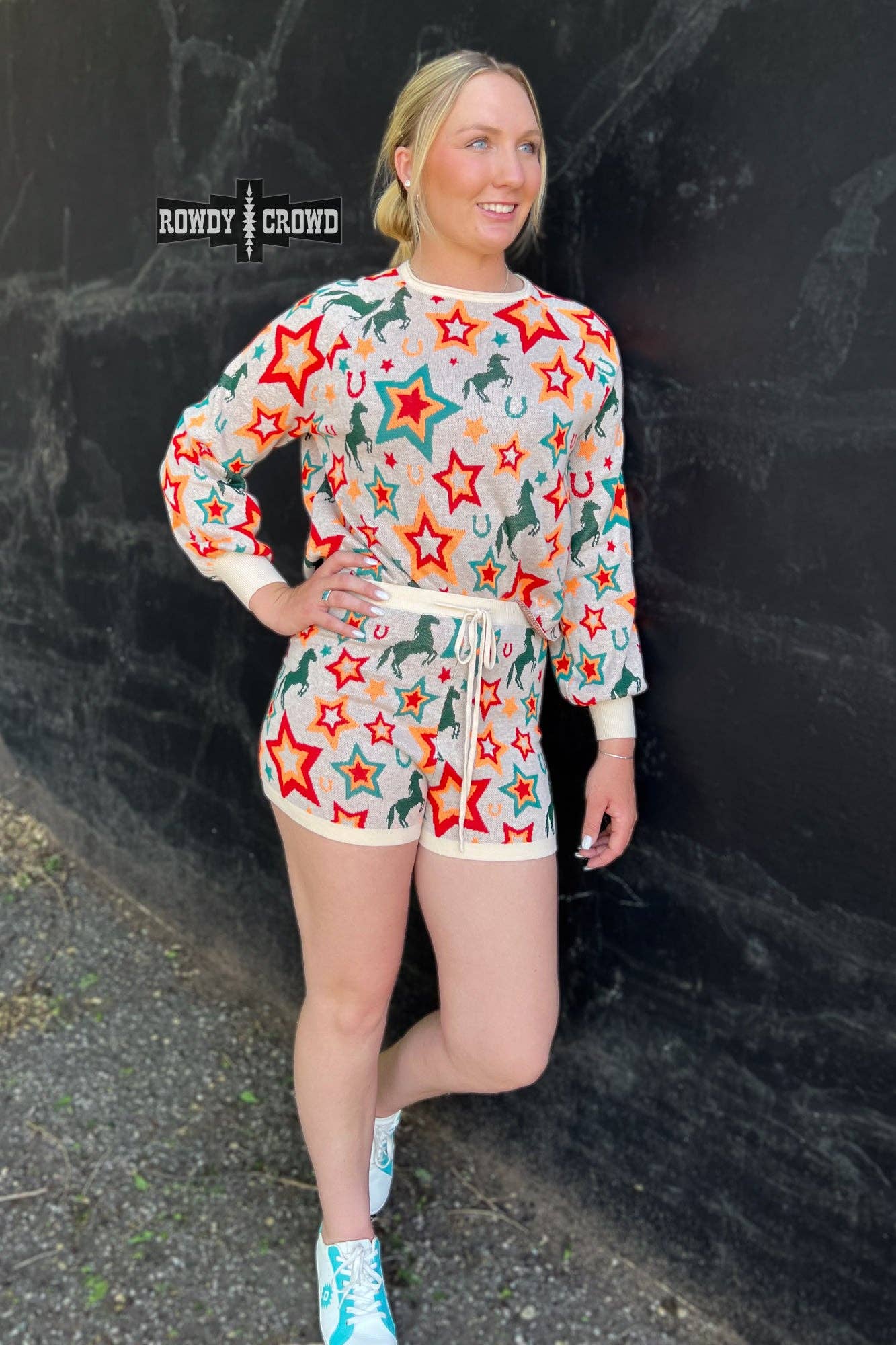 Experience unmatched comfort and style with our Way Out West Lounge Set! This set is cute and bold and features a playful horse and star print. Relax in ultimate comfort with this must-have lounge set.