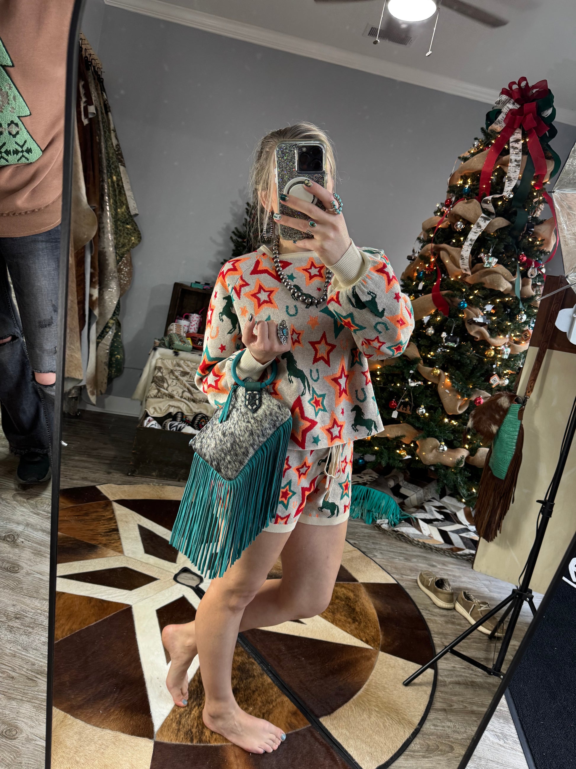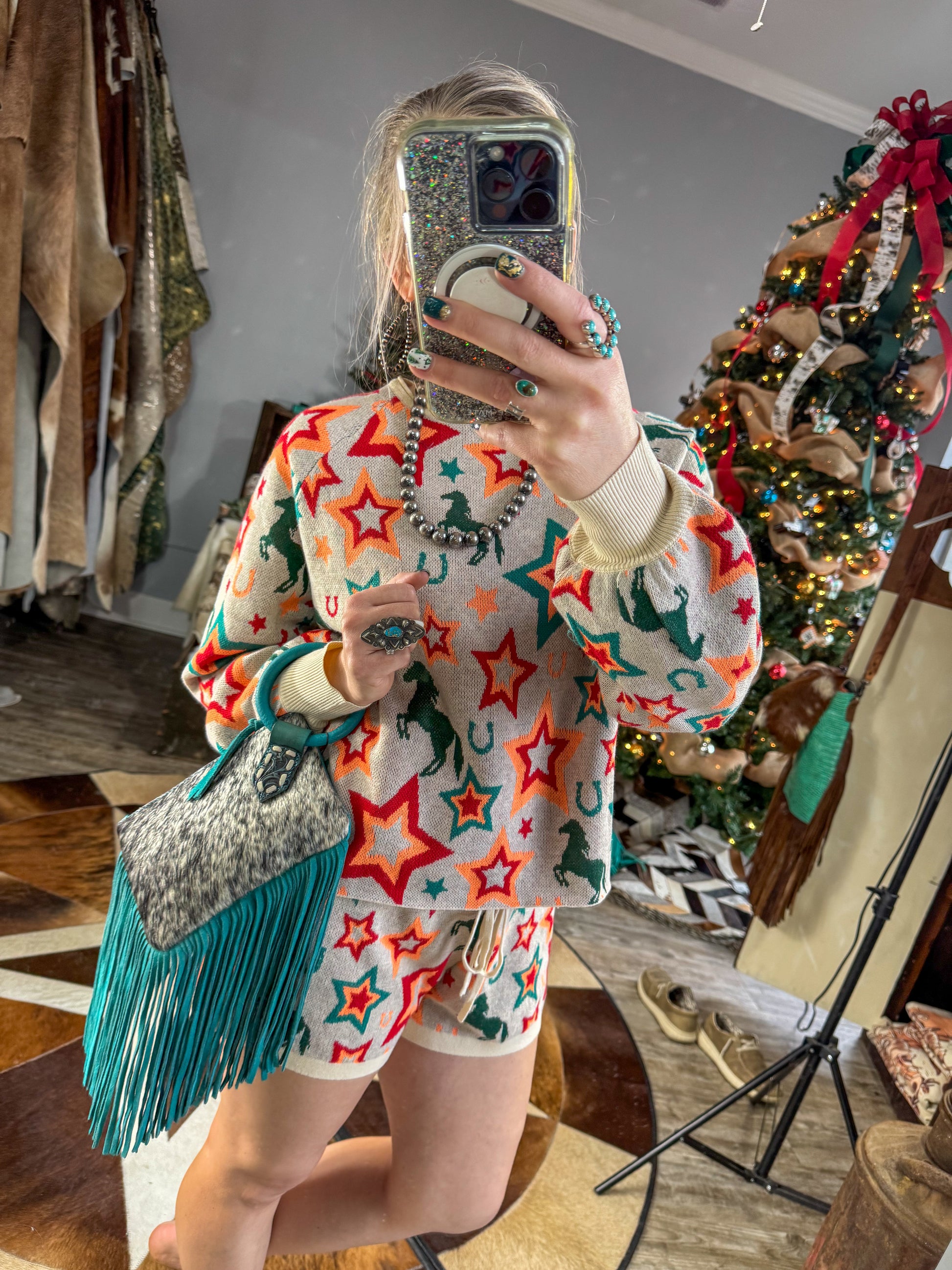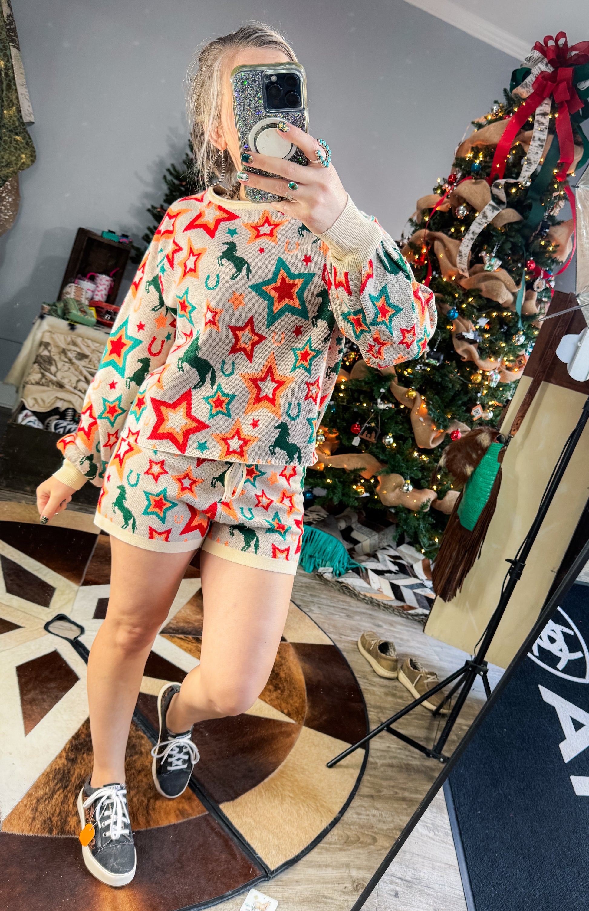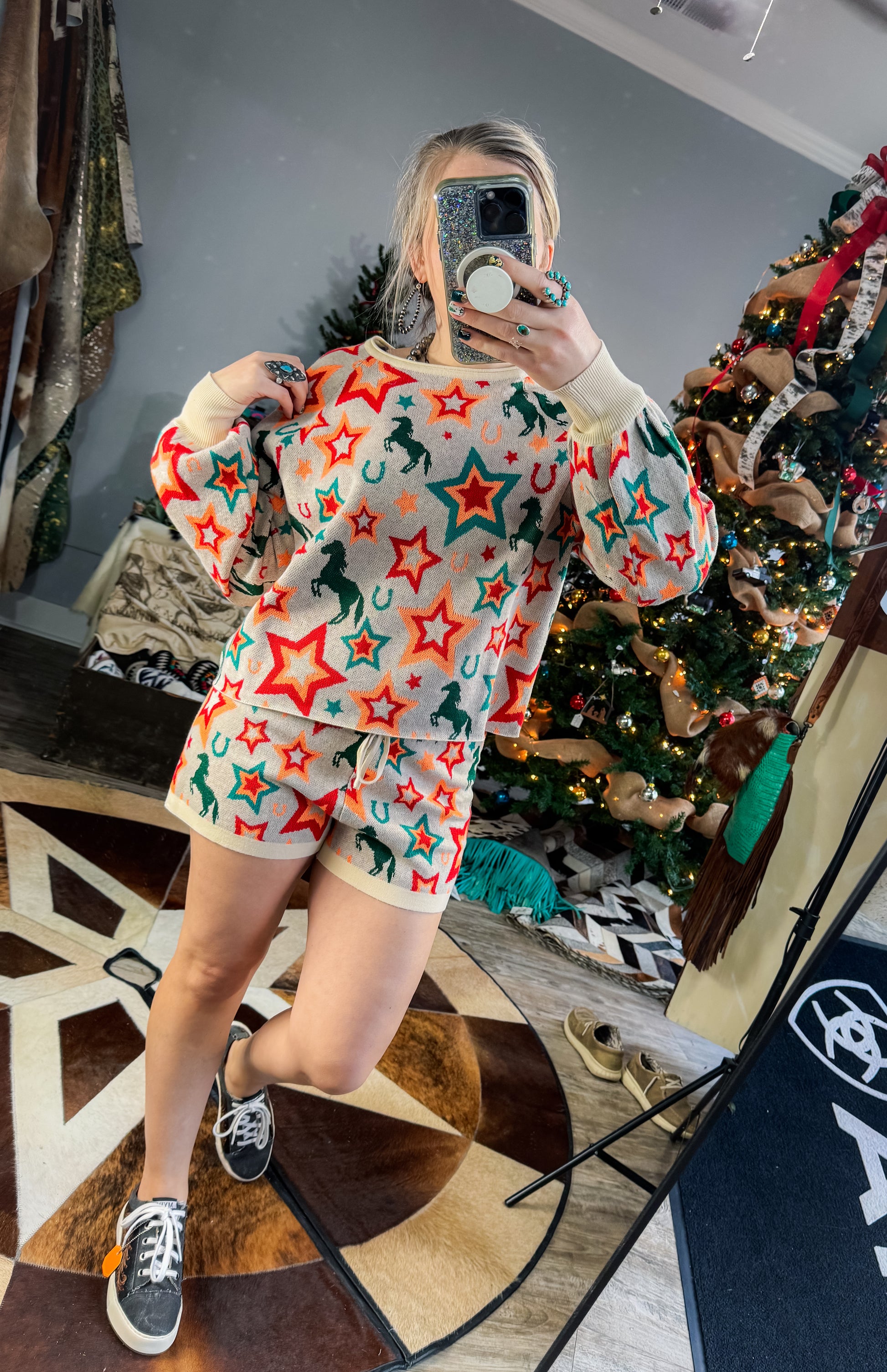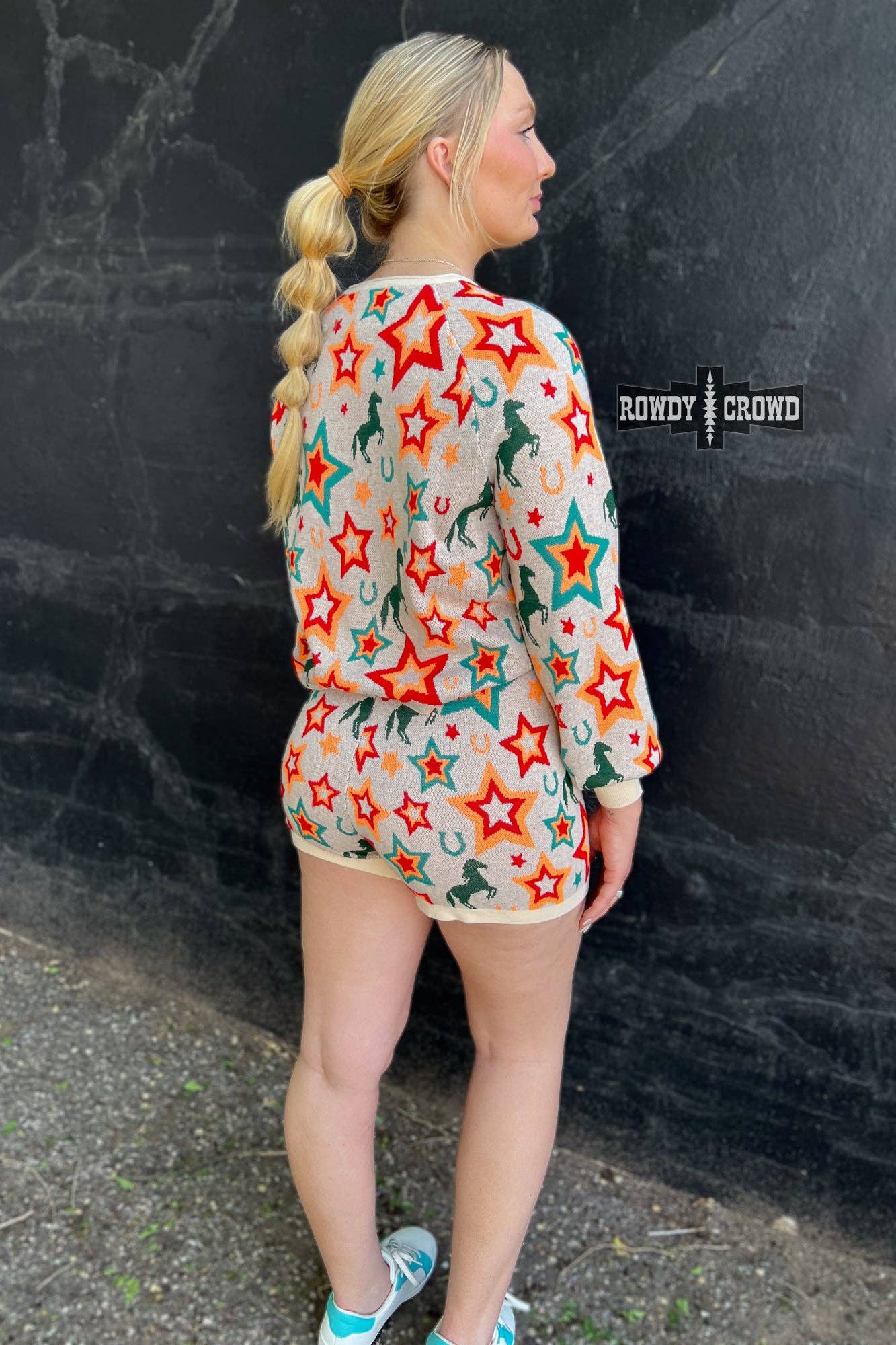 Experience unmatched comfort and style with our Way Out West Lounge Set! This set is cute and bold and features a playful horse and star print. Relax in ultimate comfort with this must-have lounge set.