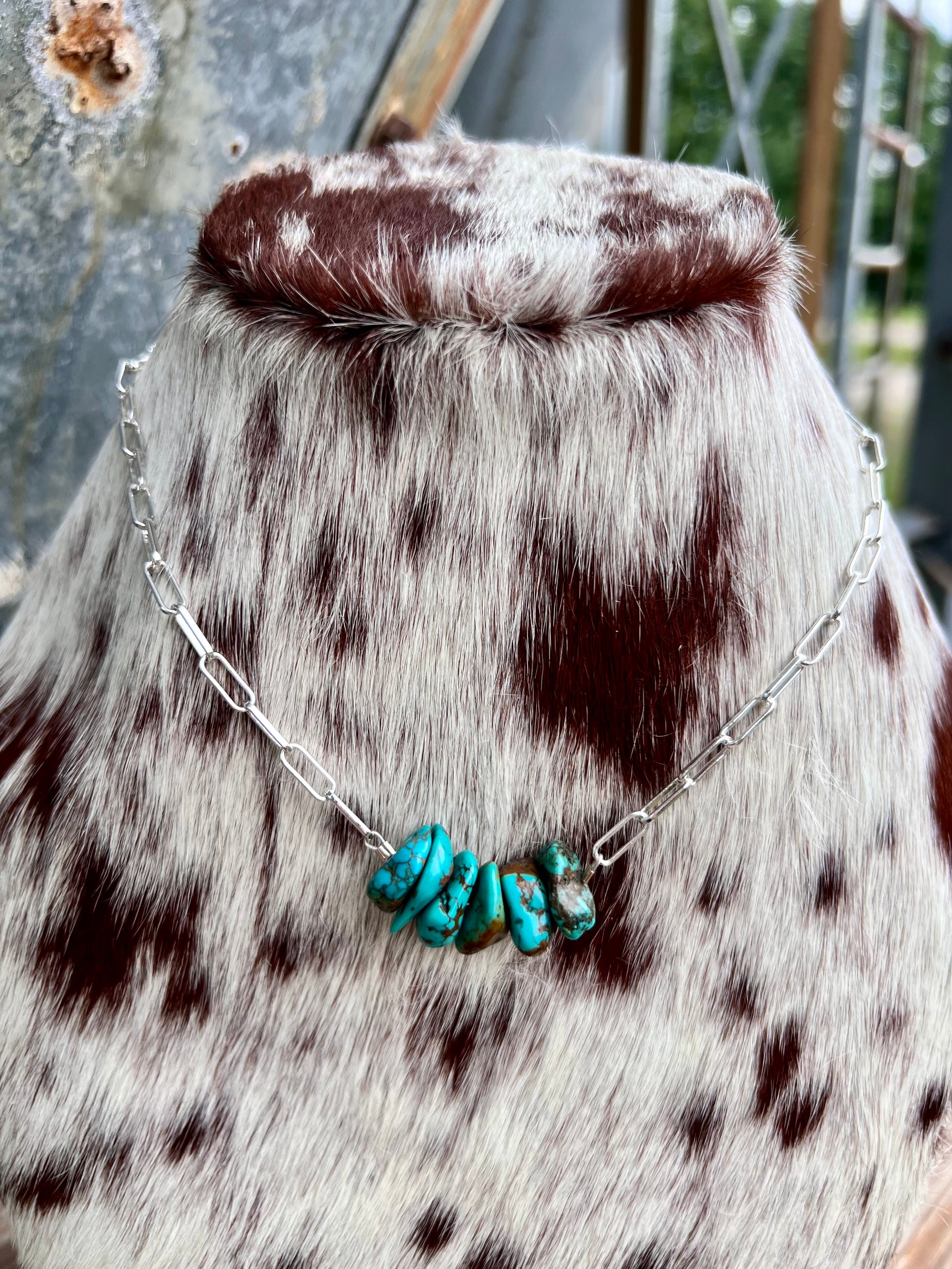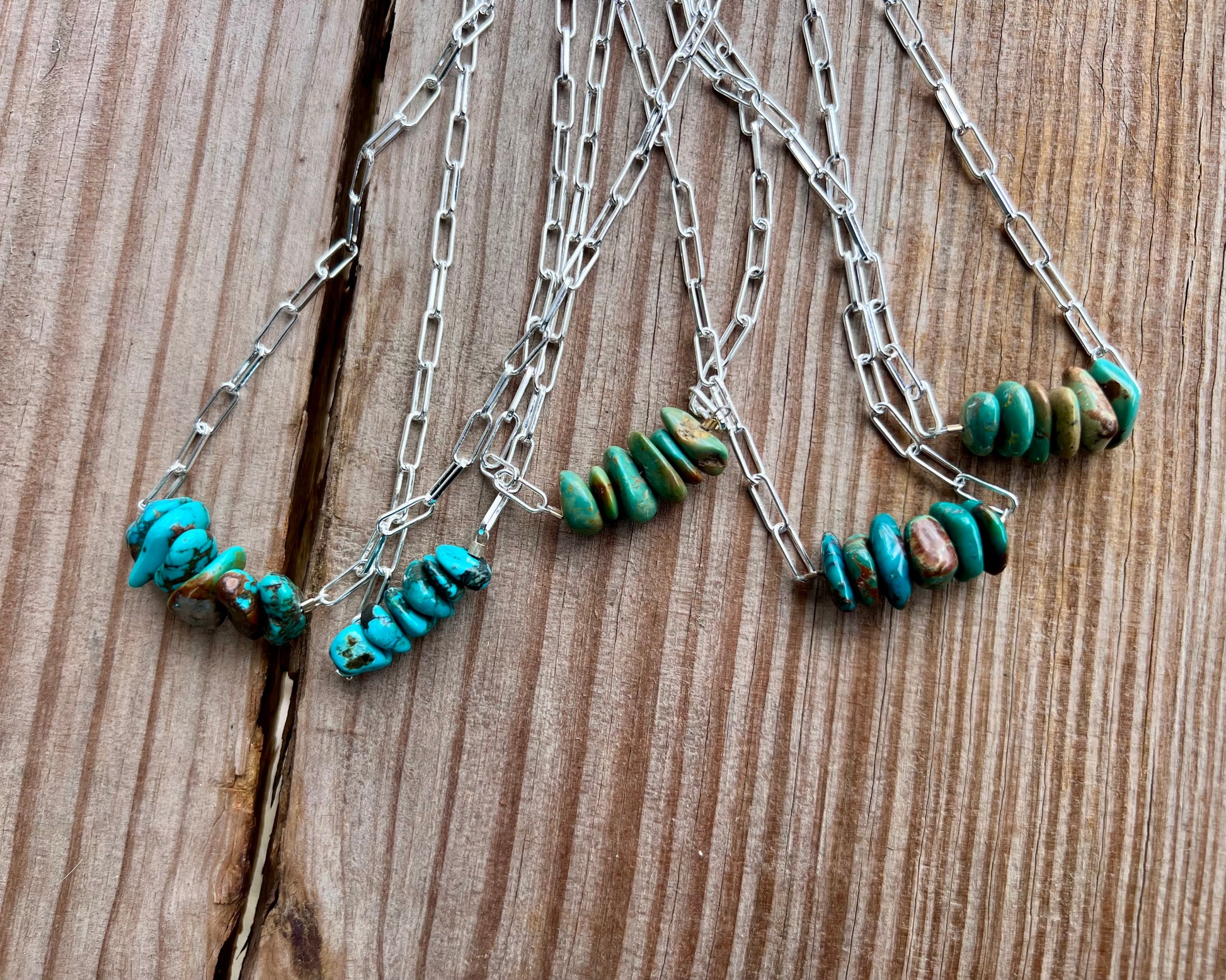 Genuine turquoise stones on silver plated paper-clip chain. Each necklace varies in the size/color of each stone.